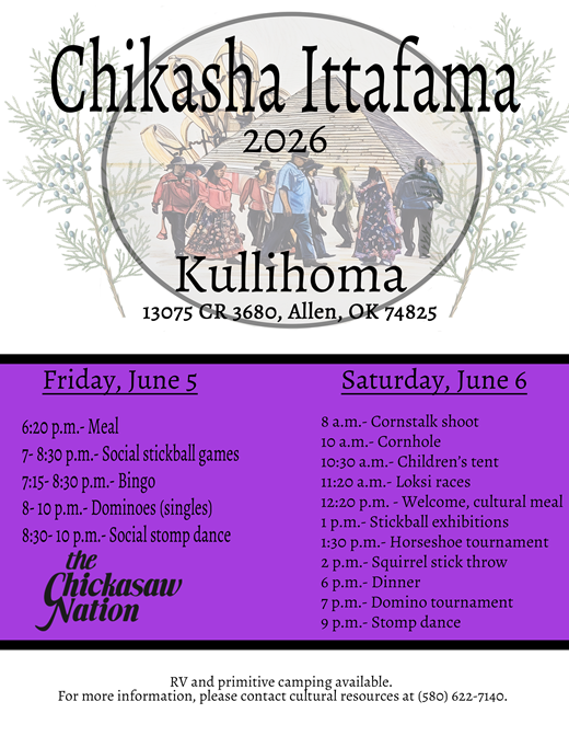 Chikasha Ittafama (Chickasaw Reunion) is a two-day celebration of Chickasaw culture, traditions and fellowship at the Kullihoma Grounds east of Ada, Oklahoma.