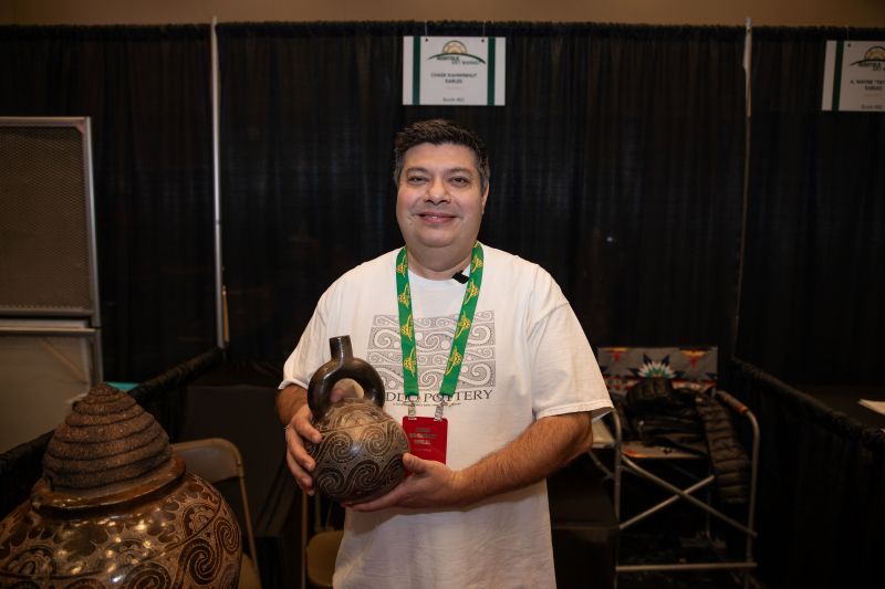 Caddo artist Chase Kahwinhut Earles’ clay pottery piece “The Caddo Story of Night and Day Jar” was named Best of Show. “The Caddo Story of Night and Day Jar” also earned Best of Show honors during October’s Southeastern Art Show and Market (SEASAM) in Tishomingo, Oklahoma.