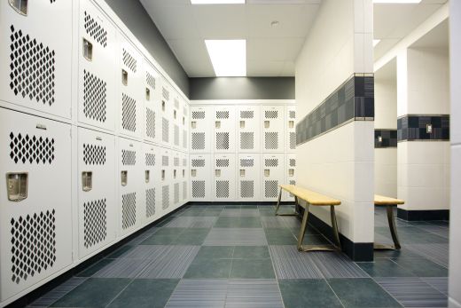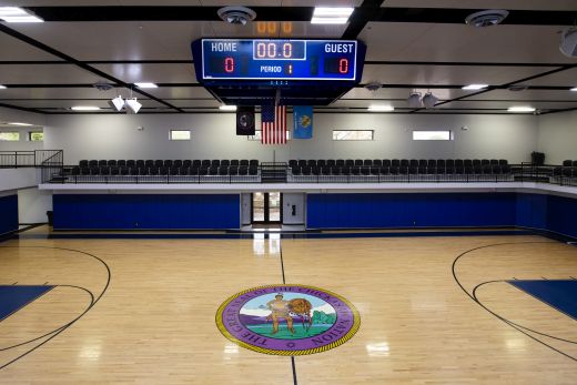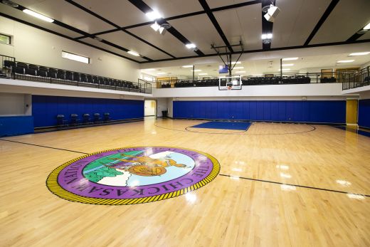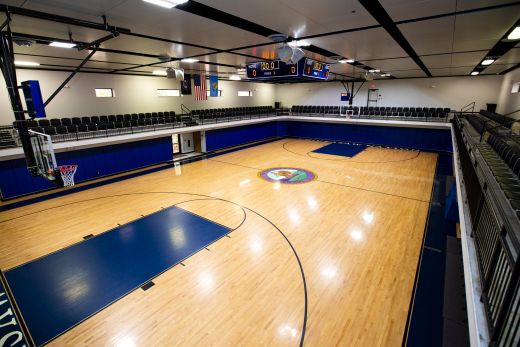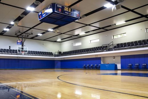 The gym also features an impact-resistant floating ceiling system and a four-sided scoreboard above the center of the court. Wall pads have been installed to provide safety for the players.