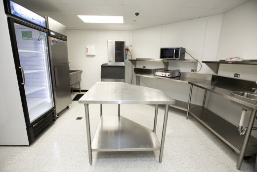 The concession area features stainless steel counters and shelves, a refrigerator and ice machine. Upstairs, there are enlarged men’s and women’s restrooms and two built-in trophy cases.